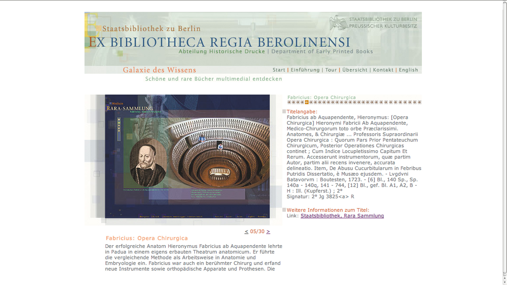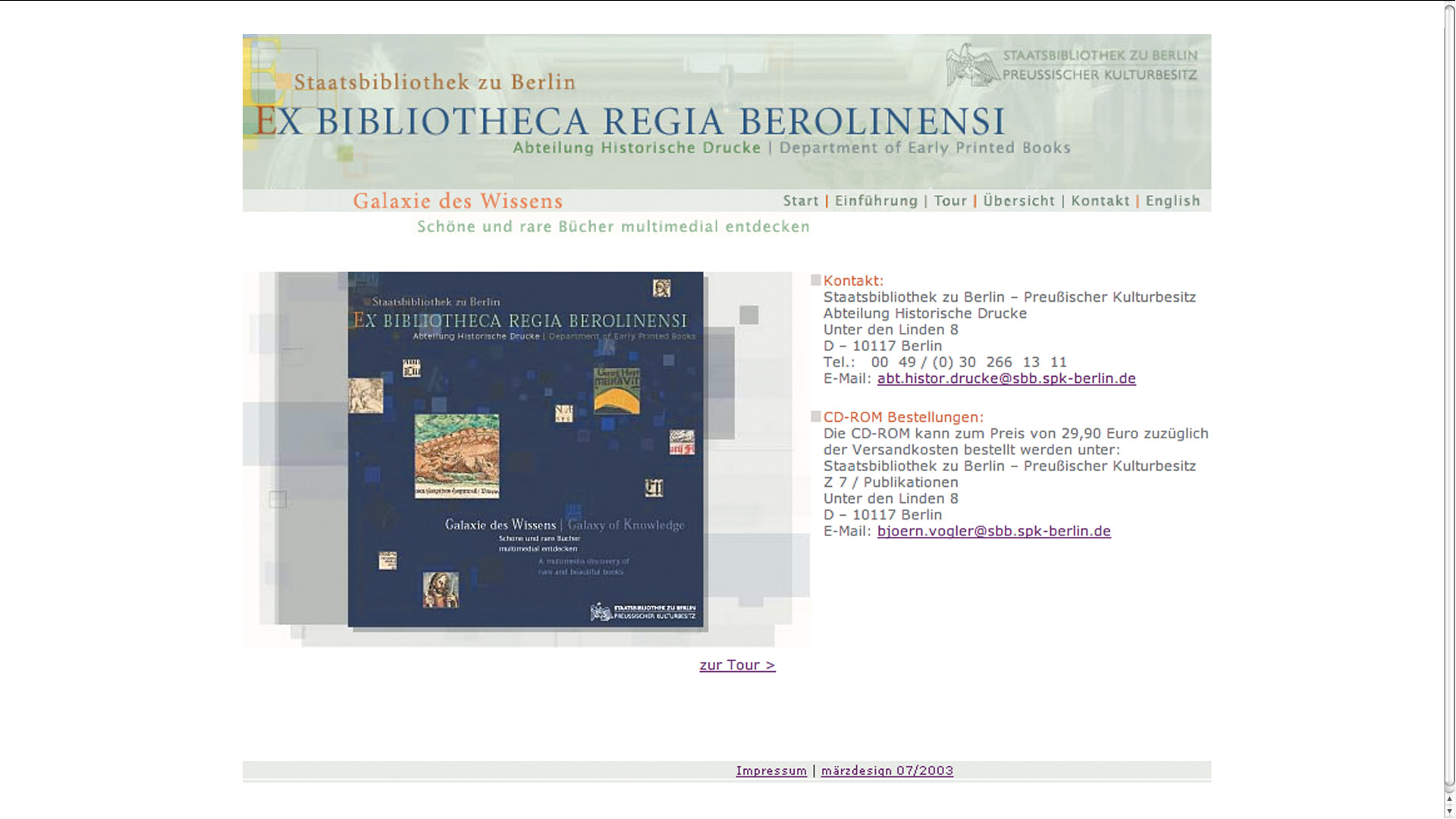 Die Internetpräsentation des Projektes »Galaxie des Wissens« kommuniziert die CD-ROM, die kostbare und rare Bücher aus dem historischen Bestand der Staatsbibliothek zu Berlin präsentiert. Neben allgemeinen Informationen zum Projekt bieten die Seiten eine Entdeckungstour mit einer Auswahl von Objekten aus der CD-ROM. Hier erhält man einen ersten Eindruck von der Vielfältigkeit der Sammlungen und Druckwerke der Staatsbibliothek und ihrer anschaulichen und lebendigen Darstellung. Der Internetauftritt soll aber auch auf die Dauerausstellungen in den Häusern der Staatsbibliothek hinweisen, wo das Informationssystem live zu erleben und auch auf CD-ROM erhältlich ist.