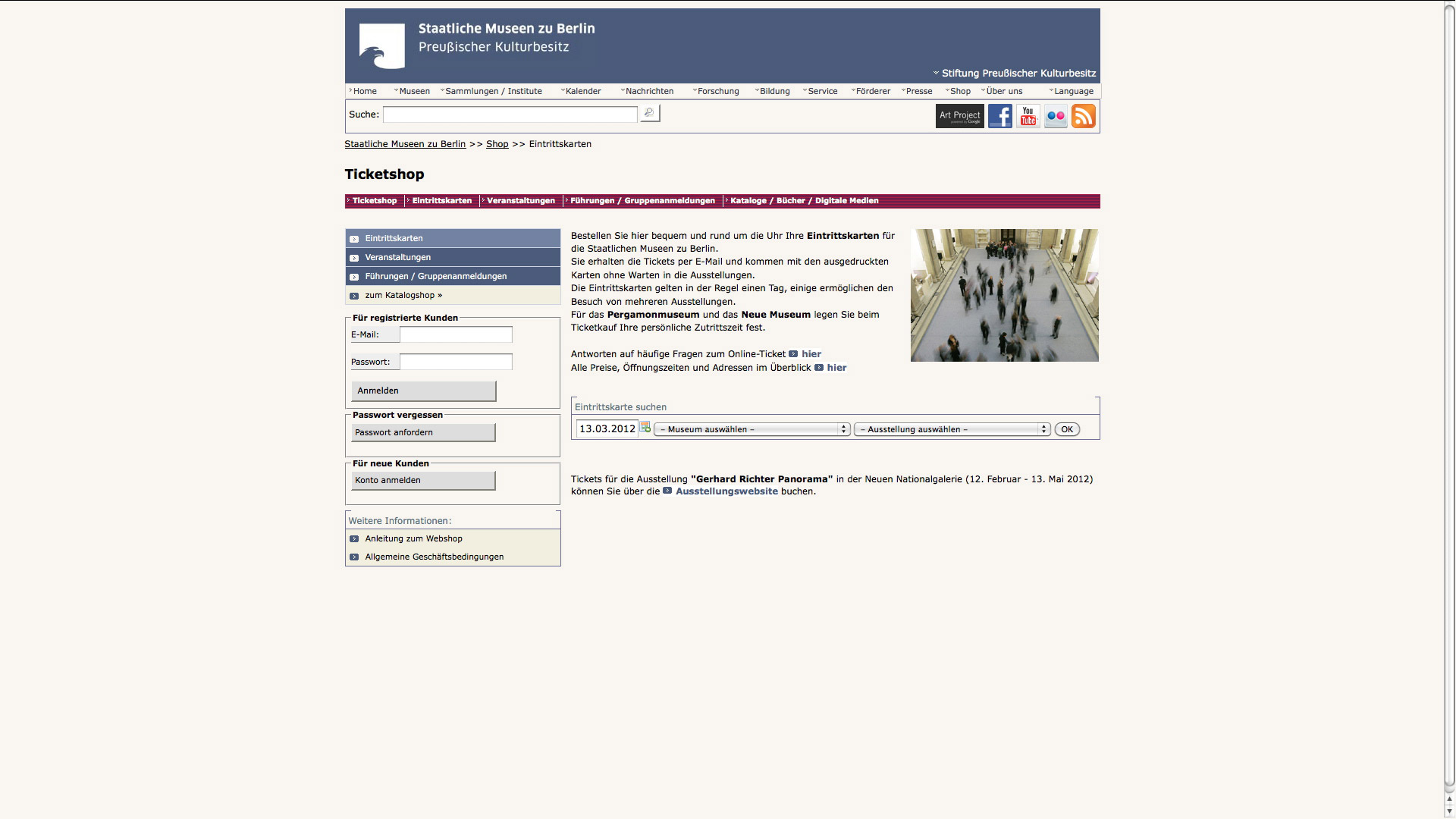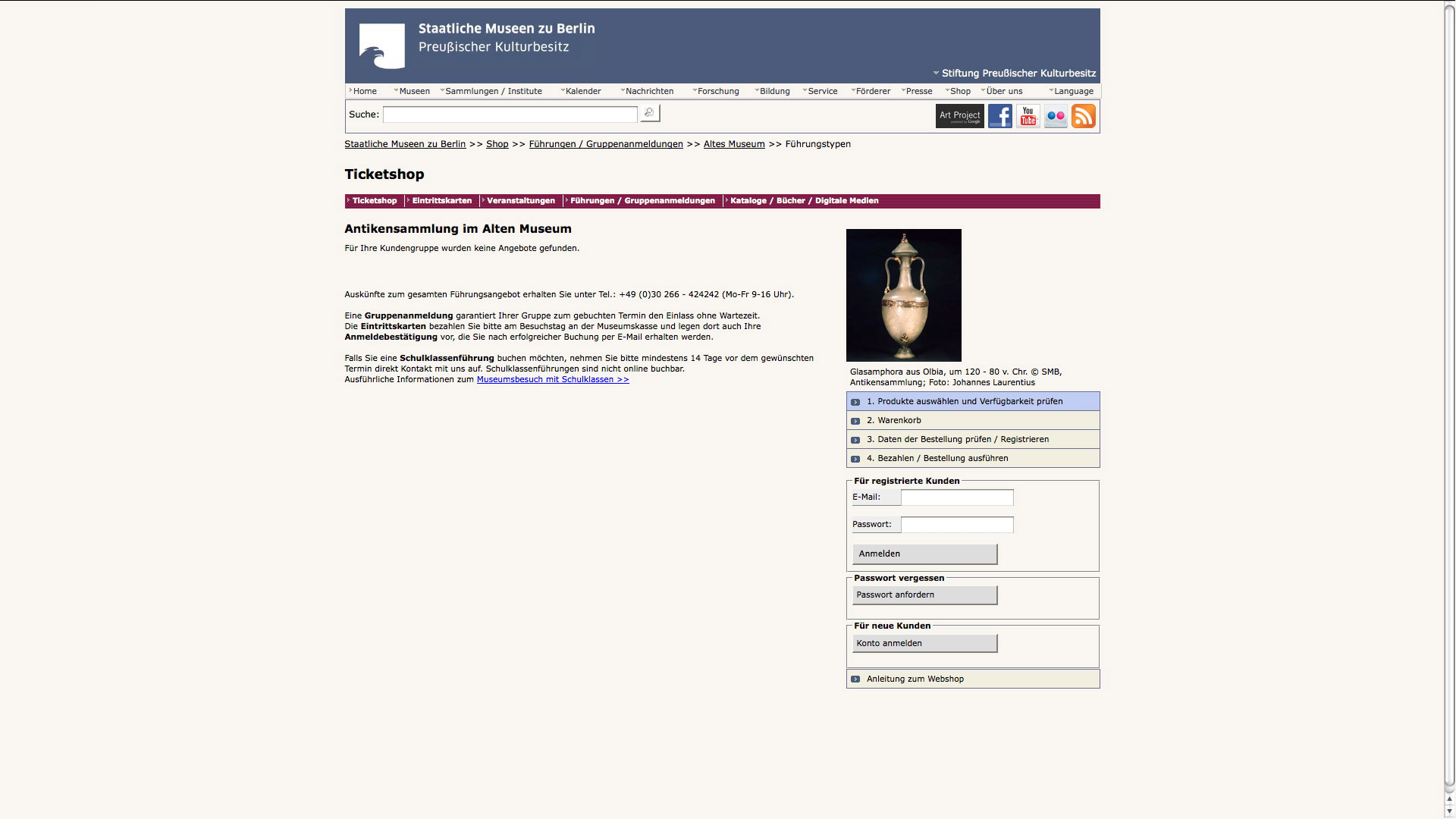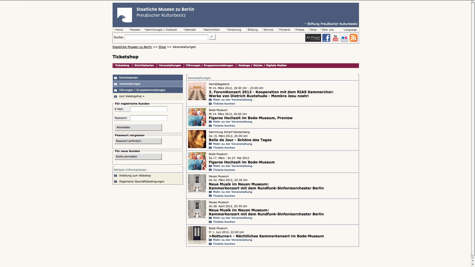 entwickelte märzdesign einen Online-Shop sowie das elektronische Buchungssystem. Den hohen Anforderungen eines Museumskomplexes wie der Museumsinsel, mit dem Pergamonmuseum, dem Bode-Museum, dem Neuen Museum und der Alten Nationalgalerie, wurde mit einem sehr variablen und intelligenten Shop- und Bestellsystem entsprochen, das sich durch eine gut strukturierte Oberfläche und Übersichtlichkeit auszeichnet; zudem ist der Bestellvorgang selbsterklärend und sehr einfach zu handhaben. Angeboten werden verschiedenste Produkte wie z.B. Eintrittskarten, Veranstaltungen, Führungen, Gruppenanmeldungen, Kataloge, Bücher und Digitale Medien.