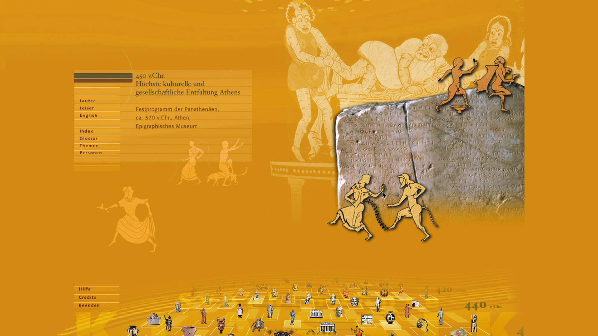 Das »digitale Geschichtsbuch« bietet einen Überblick über die wichtigsten Entwicklungen und Ereignisse der griechischen Klassik. Auf einer dreidimensionalen Zeitleiste kann der Besucher durch die Geschichte navigieren und Informationen zu ausgewählten Themen aus Kultur und Politik abrufen. Etwa 100 Ereignisse im Zeitraum von 500 bis 336 v. Chr. werden anschaulich dargestellt. Bestimmte Themenkomplexe lassen sich zudem in ihrer geschichtlichen Entwicklung nachvollziehen: Farbige Verbindungslinien knüpfen wichtige historische Begebenheiten zu Ereignisketten zusammen, so kann der Betrachter beispielsweise die Entstehung der athenischen Demokratie über einen Zeitraum von mehr als 150 Jahren verfolgen. Der multimediale Zugang zum Thema ermöglicht eine komplexe Darstellung, die der historischen Entwicklung wie der Gleichzeitigkeit von Phänomenen Rechnung trägt.