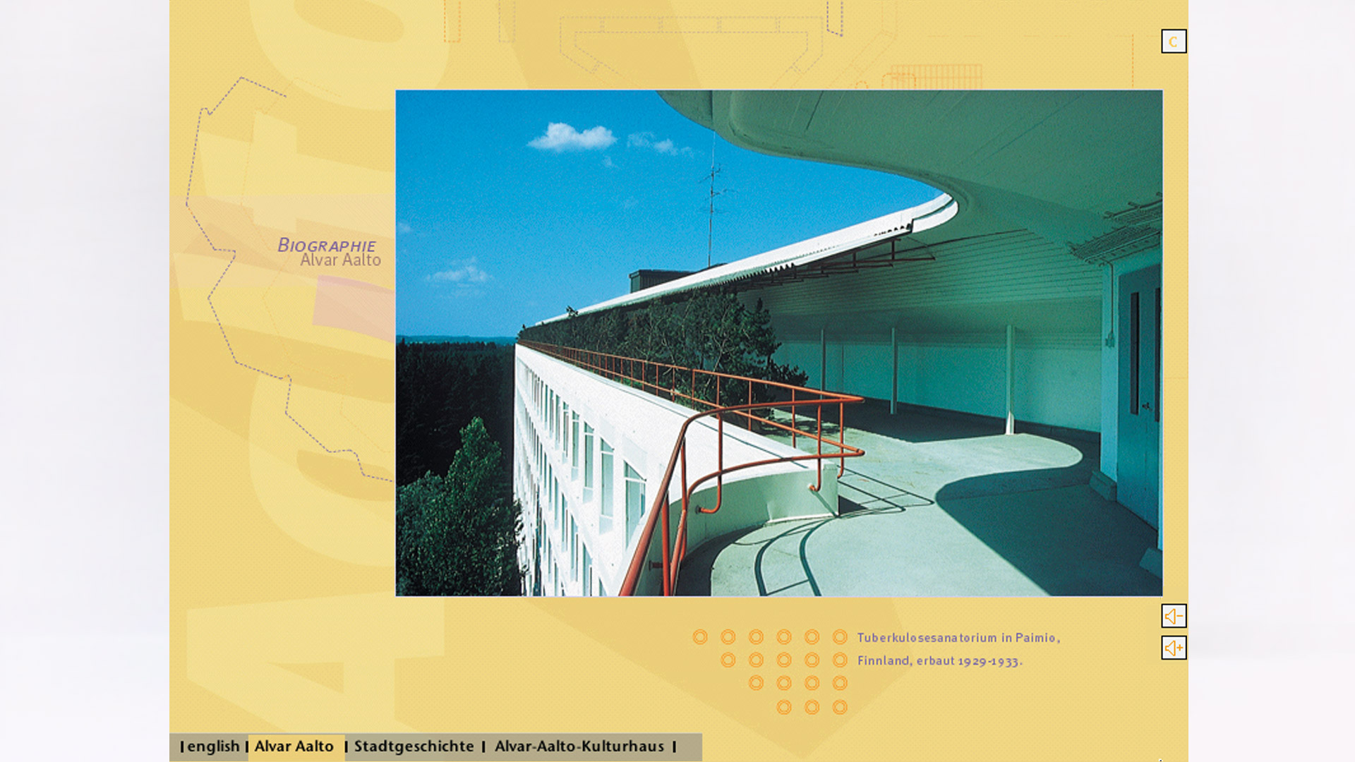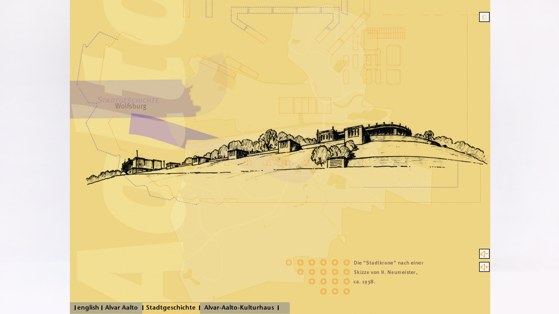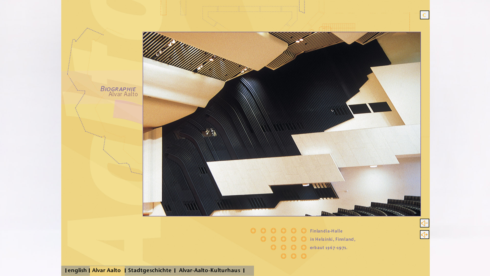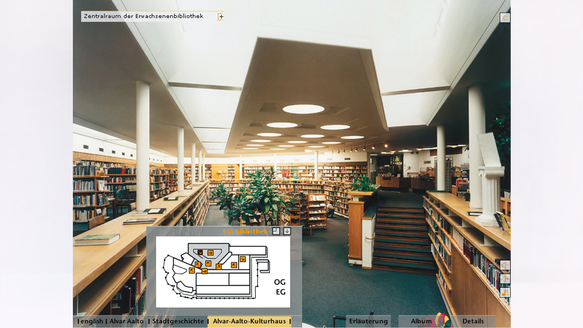 durch das 1962 erbaute Alvar-Aalto-Kulturhaus, ein wichtiges Baudenkmal, wurde von der Stadt Wolfsburg beauftragt. Der Betrachter kann beide Geschosse des Baus erkunden und typische Details sowie historische Photos studieren. Bildsequenzen bieten eine Geschichte der Stadt Wolfsburg, des Kulturhauses und eine Biographie Alvar Aaltos.