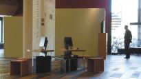 Anlässlich des internationalen Bibliothekskongresses »IFLA« (ICC/Berlin) richtete märzdesign lokale Installationen der multimedialen Anwendung »Galaxie des Wissens« in den beiden Häusern der Staatsbibliothek (Unter den Linden, Potsdamer Strasse) in Berlin ein. Das Präsentationsensemble, bestehend aus Computer-Terminals und Fahnen im Innen- und Außenbereich, ist zurückhaltend gestaltet und fügt sich in die Architektur der beiden Häuser ein. Die Fahnen greifen wiederum das grafische Konzept der »Galaxie des Wissens« auf und leiten den Besucher vom Außen- in den Innenbereich zur eigentlichen Dauerausstellung. Auch Passanten, die Unter den Linden flanieren, können die virtuelle Präsentation der historischen Druckwerke erleben, ohne die Staatsbibliothek betreten zu müssen: Im überdachten Bereich vor dem Brunnenhof ist ein Informations-Terminal installiert, das von märzdesign eigens für diesen Einsatzzweck entwickelt wurde. Ein klimatisiertes, wettergeschütztes Gehäuse integriert neben dem Computer einen 40-Zoll-Flachbildschirm. Besucher, die sich nicht durch den vorgegebenen Video-Selbstablauf, sondern selbstständig und interaktiv informieren möchten, können dies mithilfe eines Eingabegerätes (Trackball). Das System läuft 24 Stunden und lenkt auch nach den Öffnungszeiten viele Blicke auf die Staatsbibliothek zu Berlin.